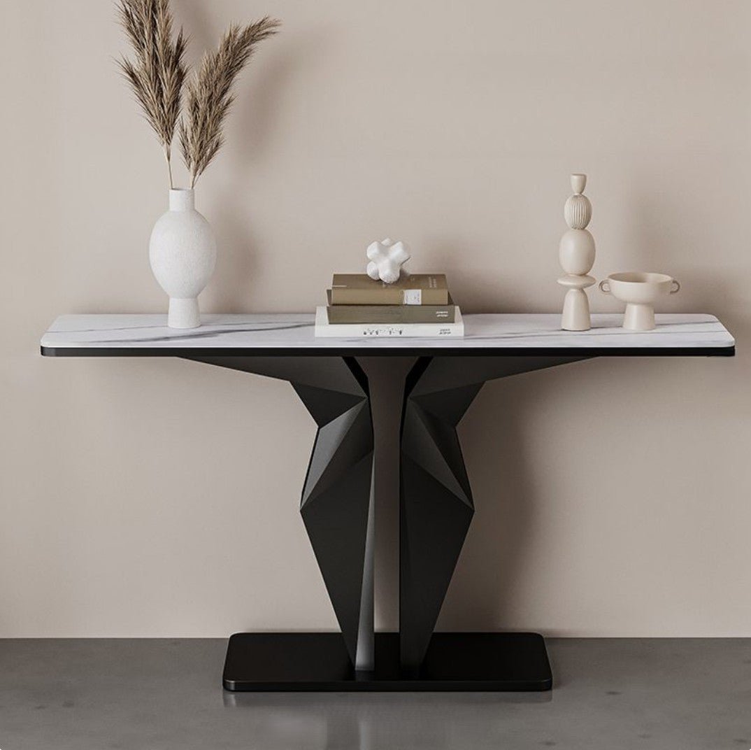 The Echo Console Table is a striking blend of modern artistry and everyday function. Its bold sculptural base, defined by clean geometric lines in a matte black finish, creates a powerful statement, while the slim marble-effect top offers a refined contrast and practical surface for styling.