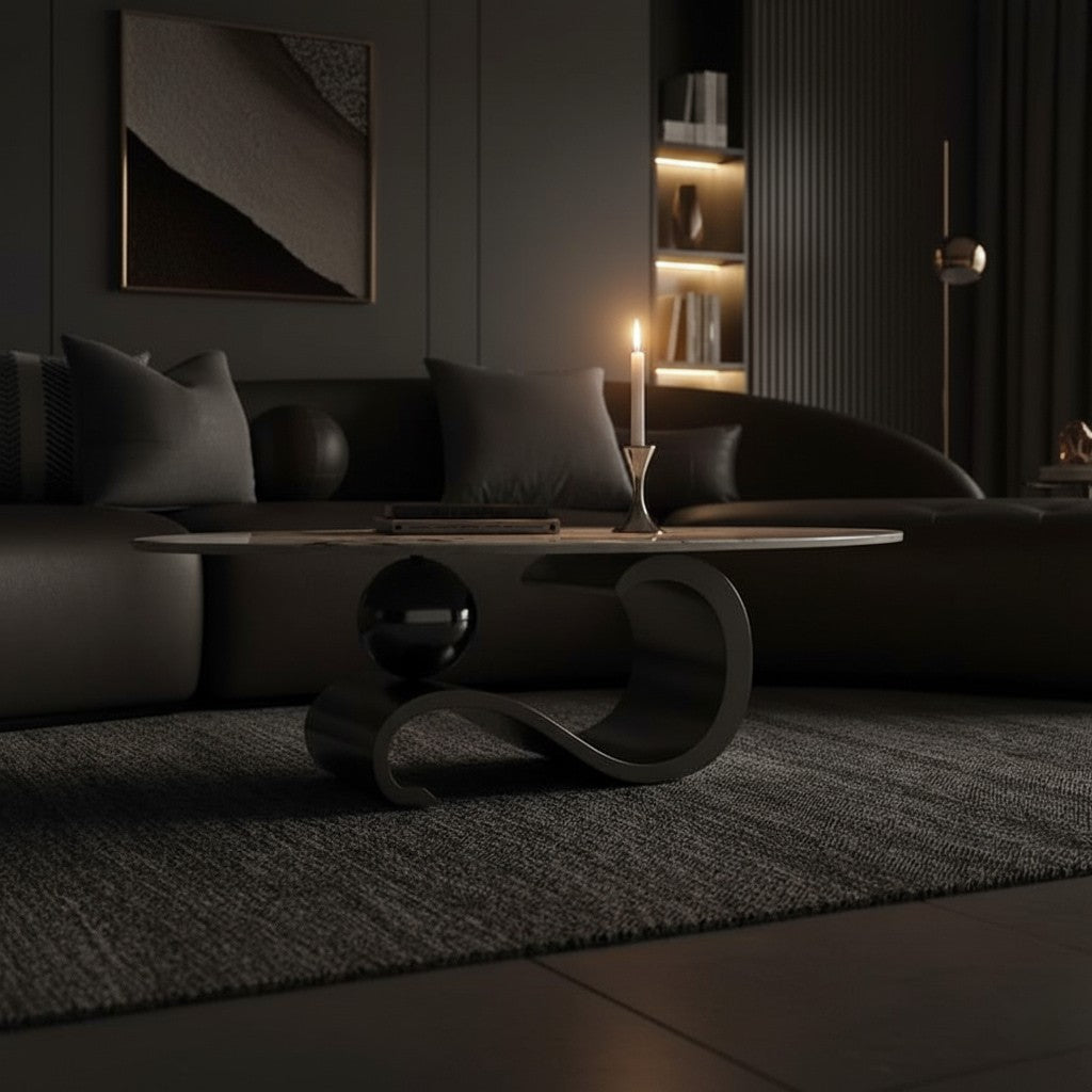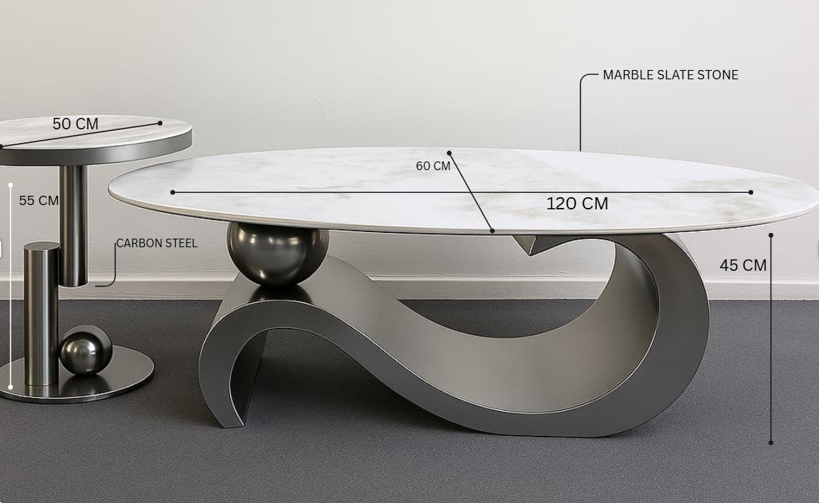 The Plomo Coffee & Side Table Set is a striking blend of art and function, designed to make a bold statement in any living space. Its oval 12mm marble top showcases natural veining, while the sculptural wave shaped steel base with a polished sphere accent creates a floating, architectural silhouette.