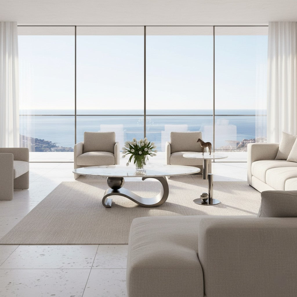 PLOMO Coffee & Side Table Set – Marble Top with Sculptural Steel Base