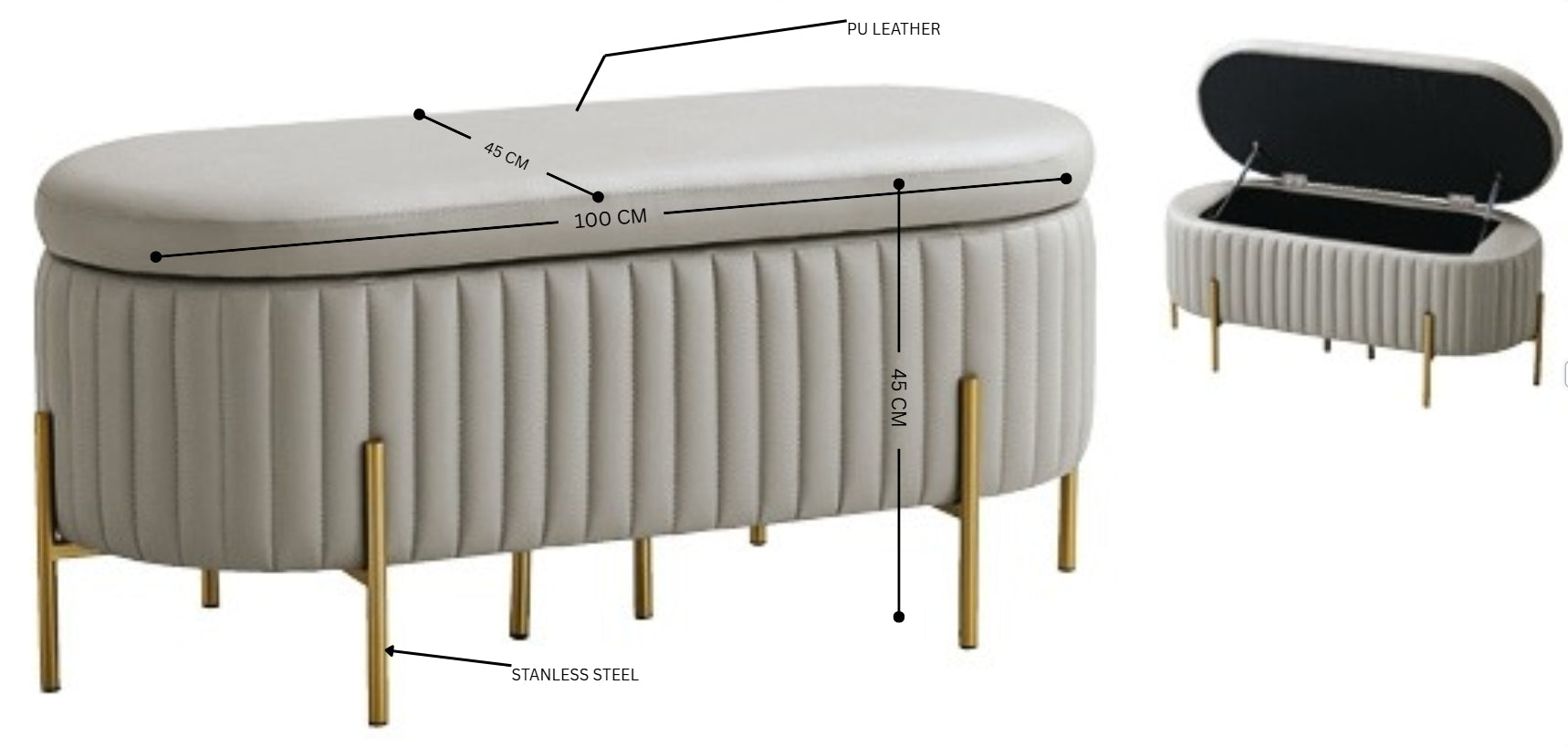 VILLENEUVE Luxe Storage Ottoman Bench – Light Grey PU Leather with Golden Accents